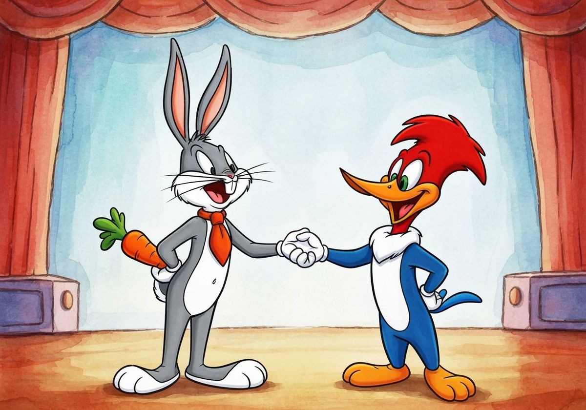 A vibrant image showing Bugs Bunny shaking hands with Woody Woodpecker. The watercolor backdrop evokes classic Warner Bros. cartoons with expressive brushstrokes and dynamic character exaggeration.