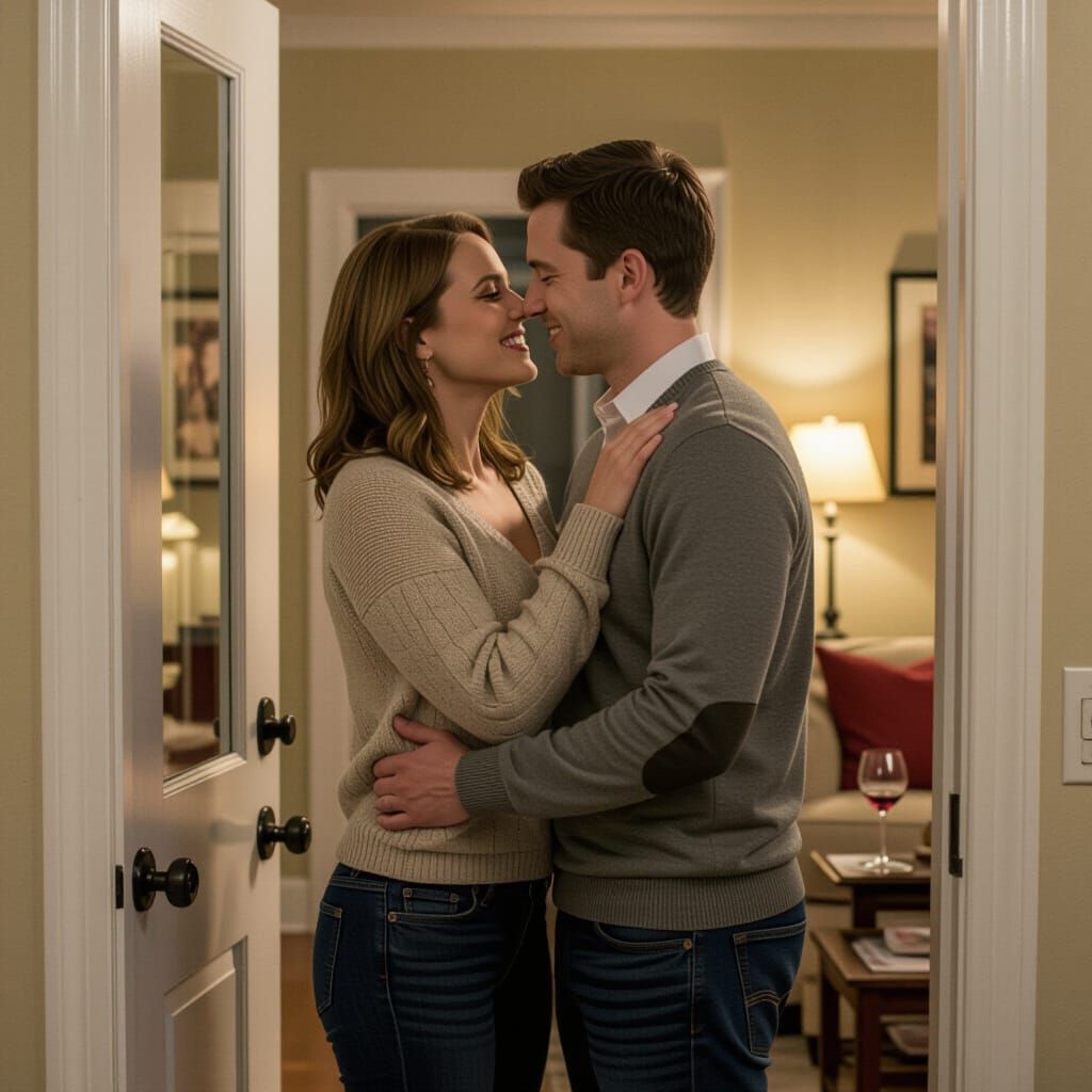 This image shows a tender kiss between a woman and a man in a warmly lit living room. The scene evokes a sensual and dreamy atmosphere with emotive portraits, ethereal illustrations, and a muted color palette.
