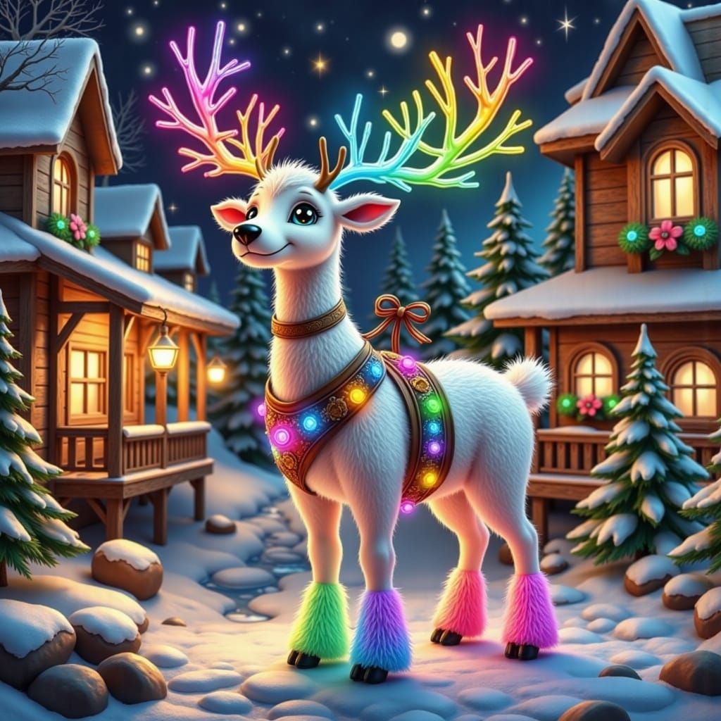 This image shows a stylized white reindeer with glowing rainbow neon lights in a snowy Christmas village. Rendered in 3D with cinematic lighting and bokeh effects, it evokes a whimsical atmosphere.