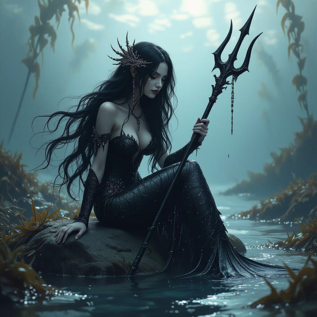 This image shows a gothic mermaid with black hair and a glitched form, sitting on a rock in a dark, kelp-filled ocean. The scene, in a glitch art style, features eerie shadows and textures.