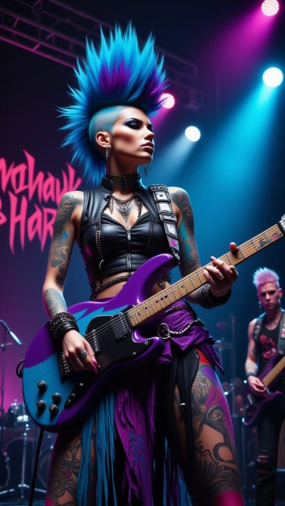 This image shows a tall, beautiful female rock singer with a blue Mohawk playing a neon guitar on stage. The scene is hyperrealistic with moody, atmospheric lighting.