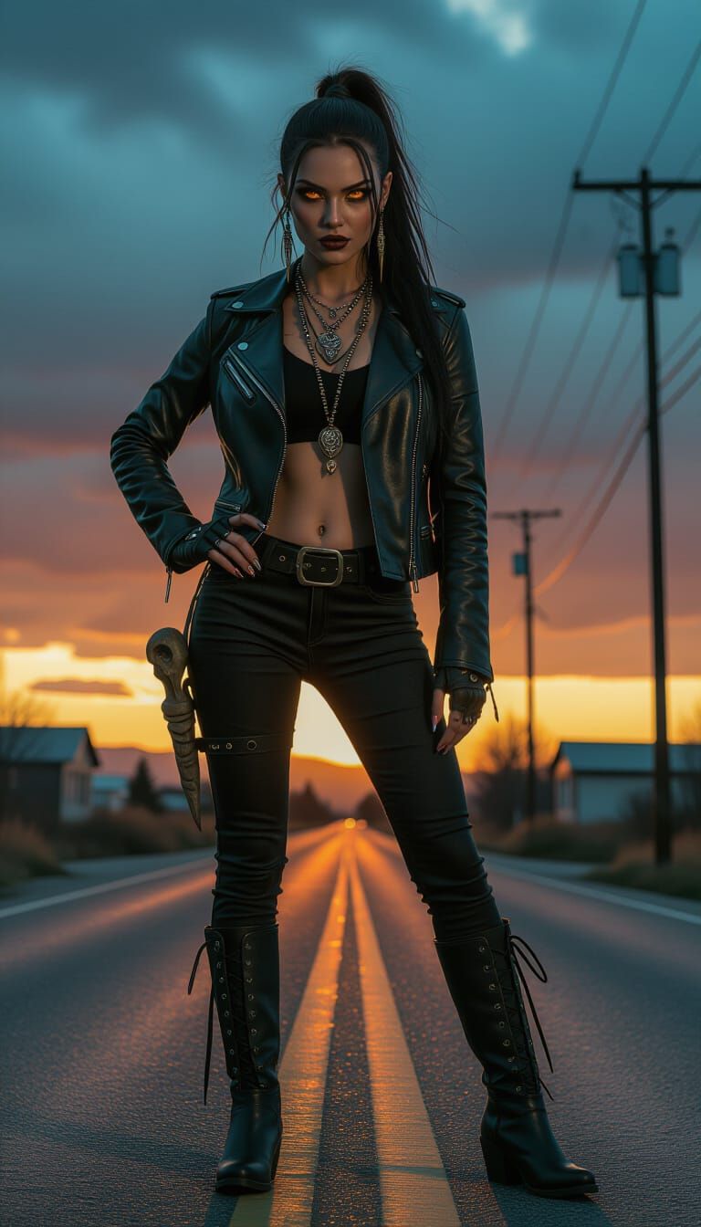 A captivating image of a troll-woman at a crossroads as a storm rages. She is a blend of fierce and haunting beauty, in an urban fantasy aesthetic with dark, moody lighting.