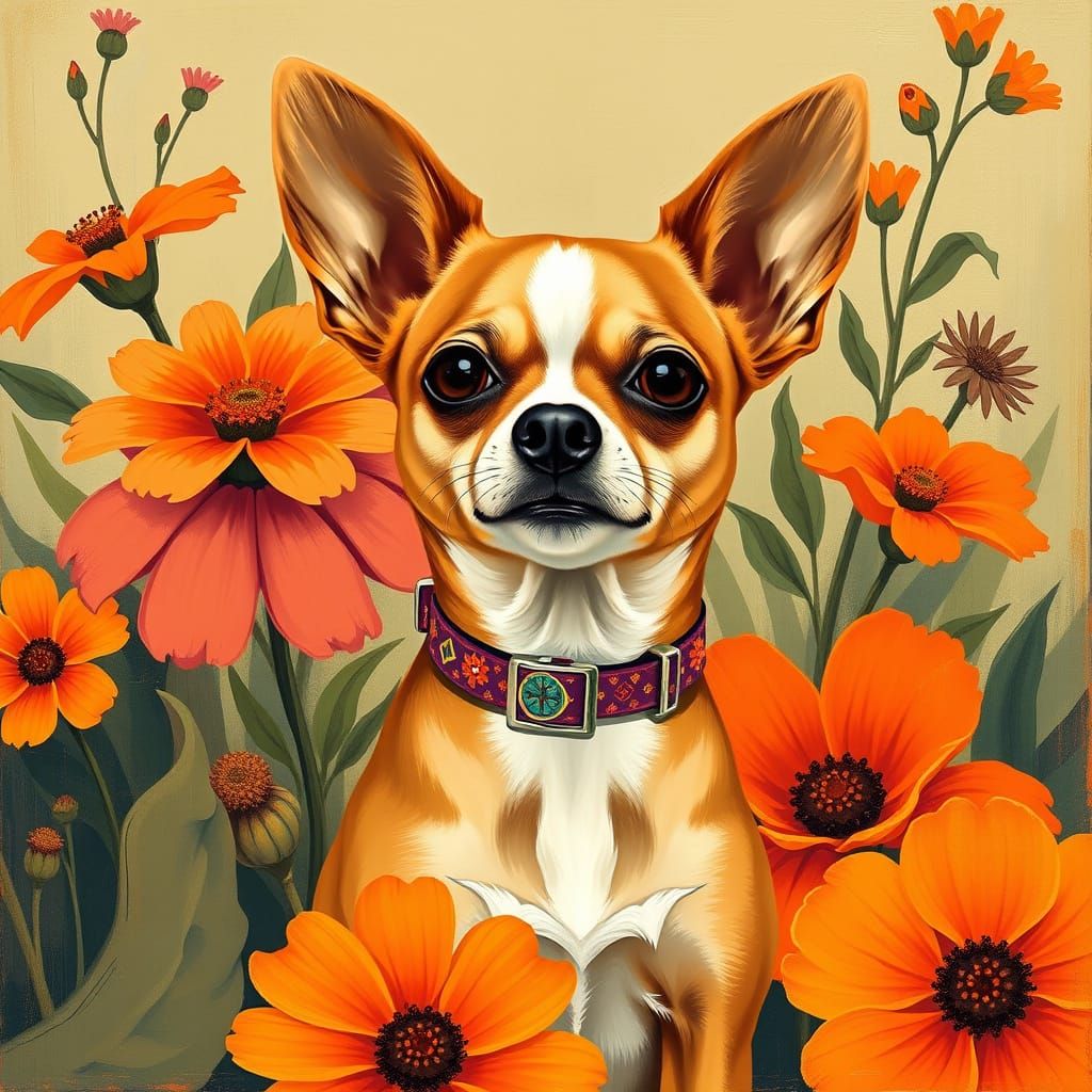 A vibrant chihuahua with a white neck patch poses among mid-century modern florals. Orange flowers and loose brushstrokes create a vivid, expressive scene in an abstract style.