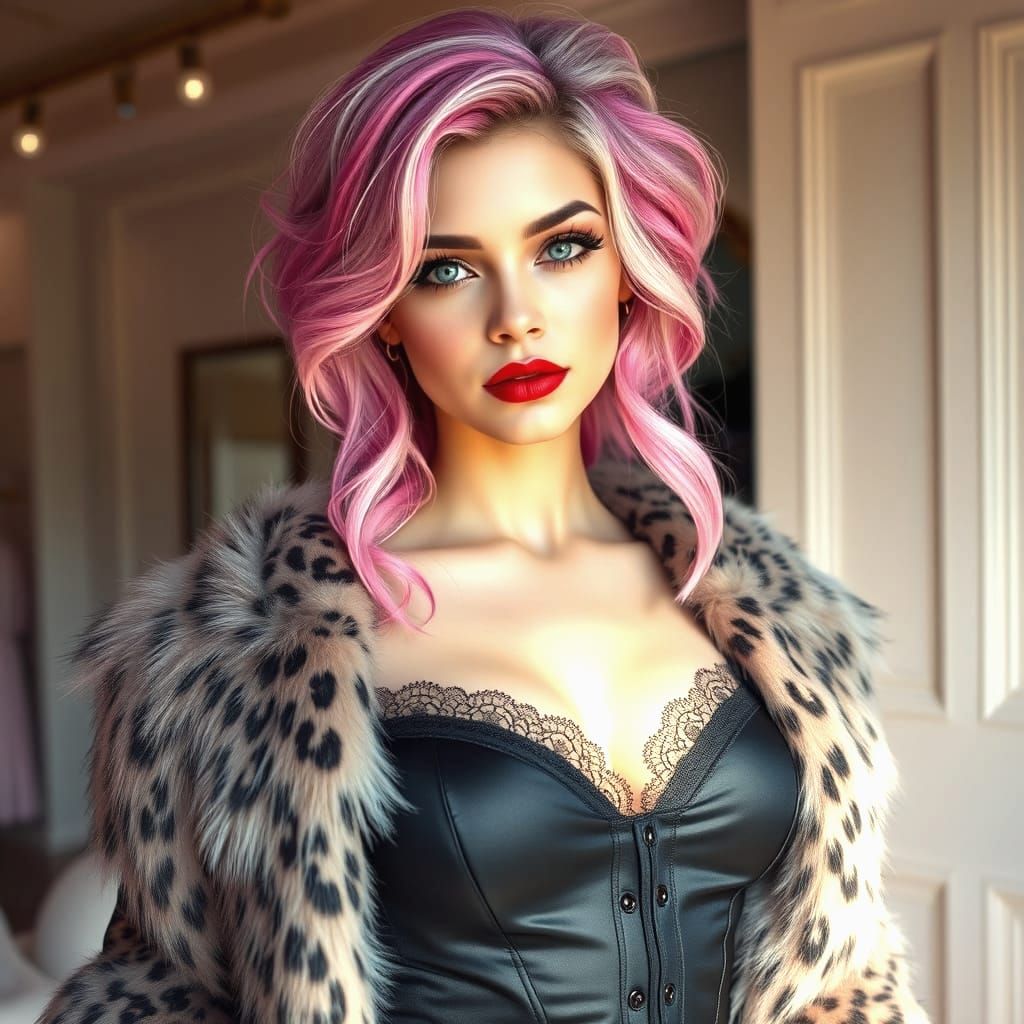 This image showcases an alternative young woman with vibrant pink and silver hair styled in loose waves, wearing a cropped leopard print jacket and a black corset mini dress with intricate lace details. Her makeup is flawless, with bold red lips and dramatic blue eyes. The soft, well-balanced lighting hi...