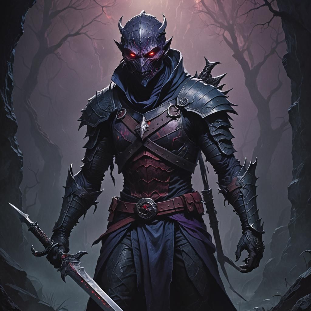 A dark fantasy image of a Silumgar Assassin, a humanoid with scaly skin and dagger, stands against a mystical background. The image features low-key lighting, moody colors, and gothic architecture.