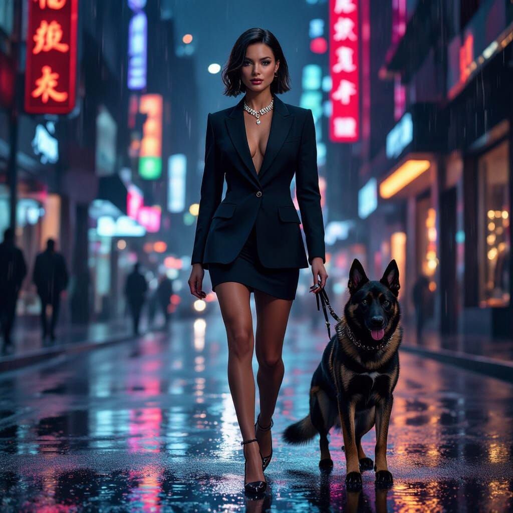 This image shows a woman in corporate attire walking through a neon-lit street. She is accompanied by a dog and wears diamond jewelry, set against a noir-inspired backdrop with cinematic contrasts.