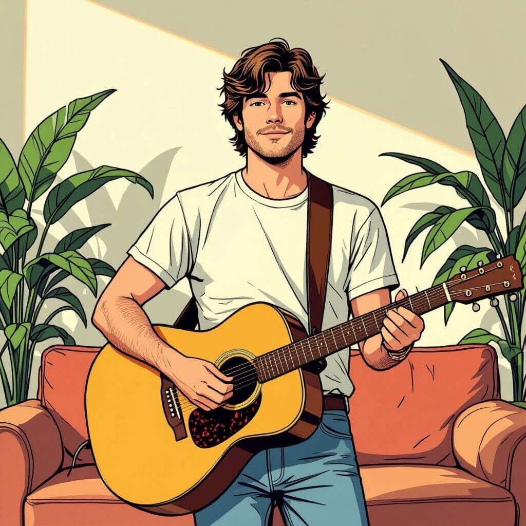 This image features a young man with a dark brown mullet holding a guitar, set against a cozy couch and plants. Rendered in a detailed comic style with bold colors and dynamic lighting.