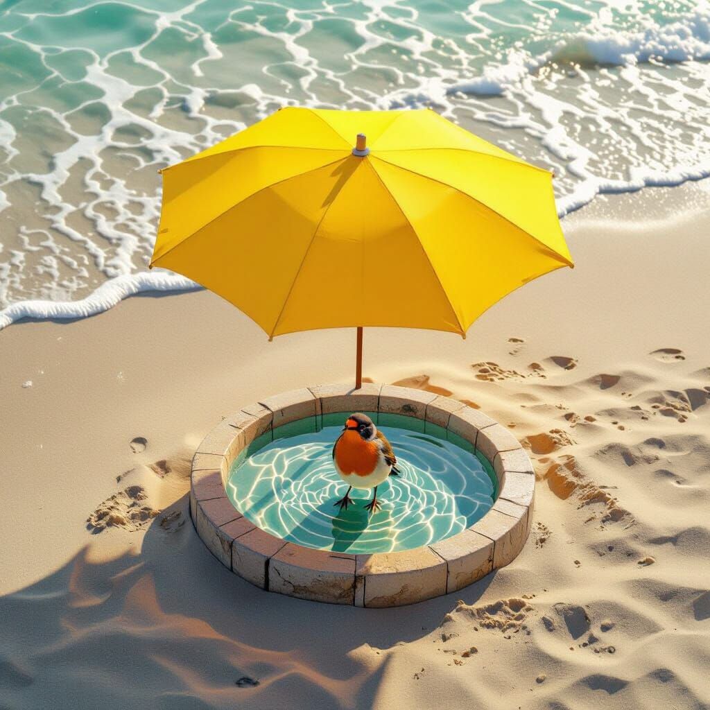 bird's eye view, a proud robin sitting in the water bird bath, on a beach with an angular yellow umbrella shaded over, dramatic lighting, vibrant colors, intricately detailed, fantastic, complementary colors, volumetric lighting, a masterpiece, surreal