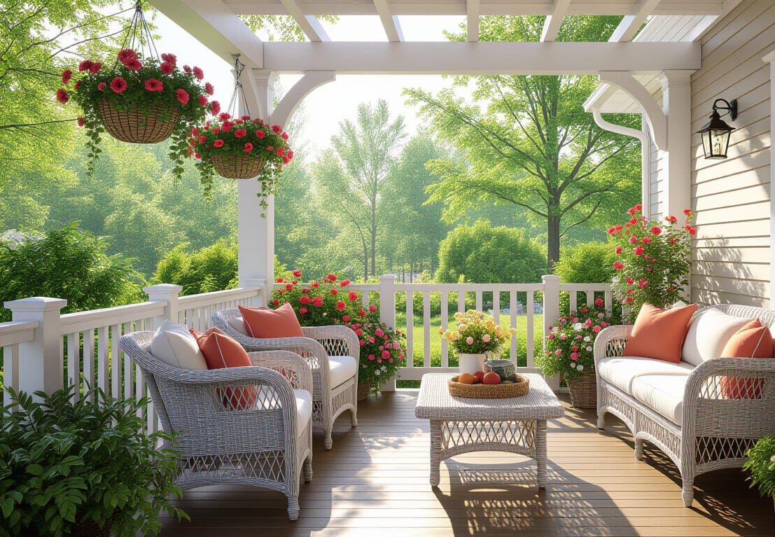 A stunningly realistic depiction of a sunlit veranda overlooking a vibrant garden, rendered in the luminous, idyllic style reminiscent of Thomas Kinkade.