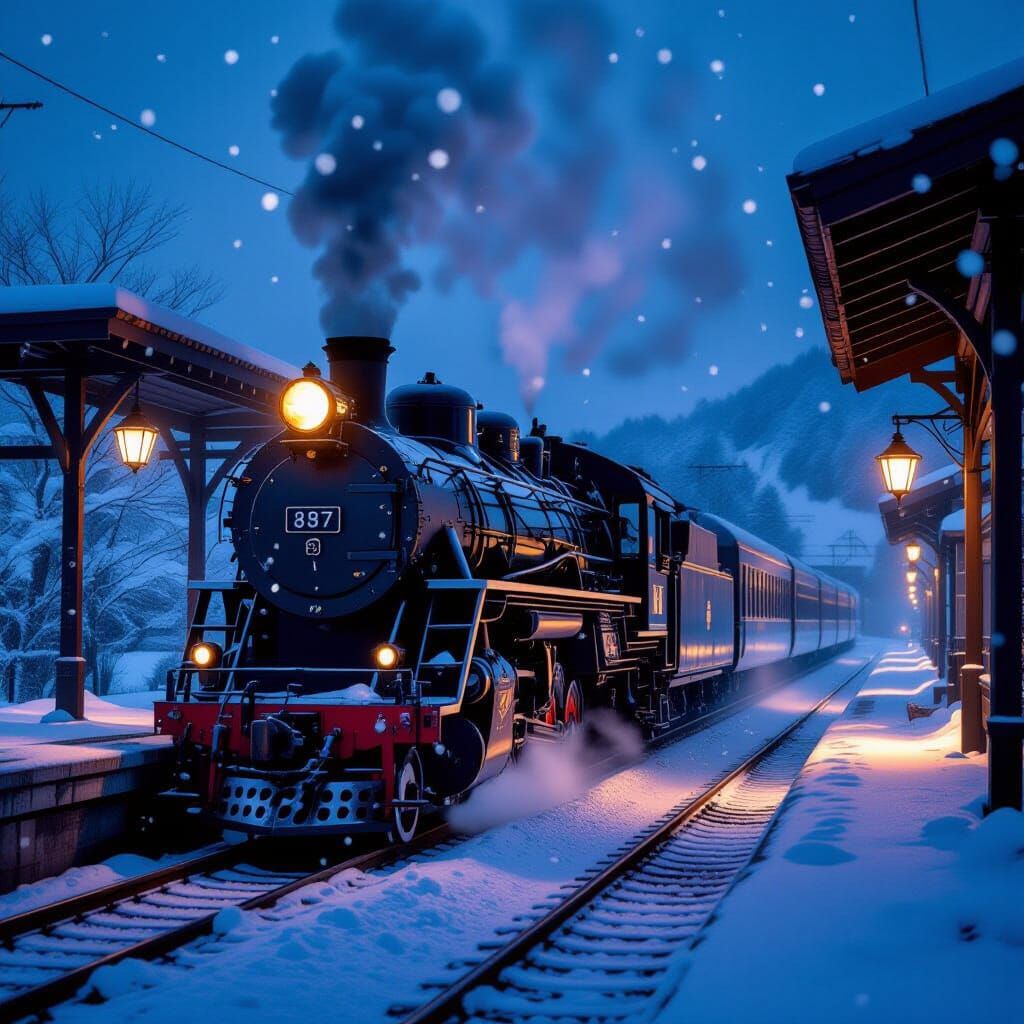 A snow-covered vintage steam train at a rural Japanese station. Soft light from gas lamps and train windows illuminates falling snow, creating eerie shadows. This image captures a photorealistic winter scene with a limited color palette.