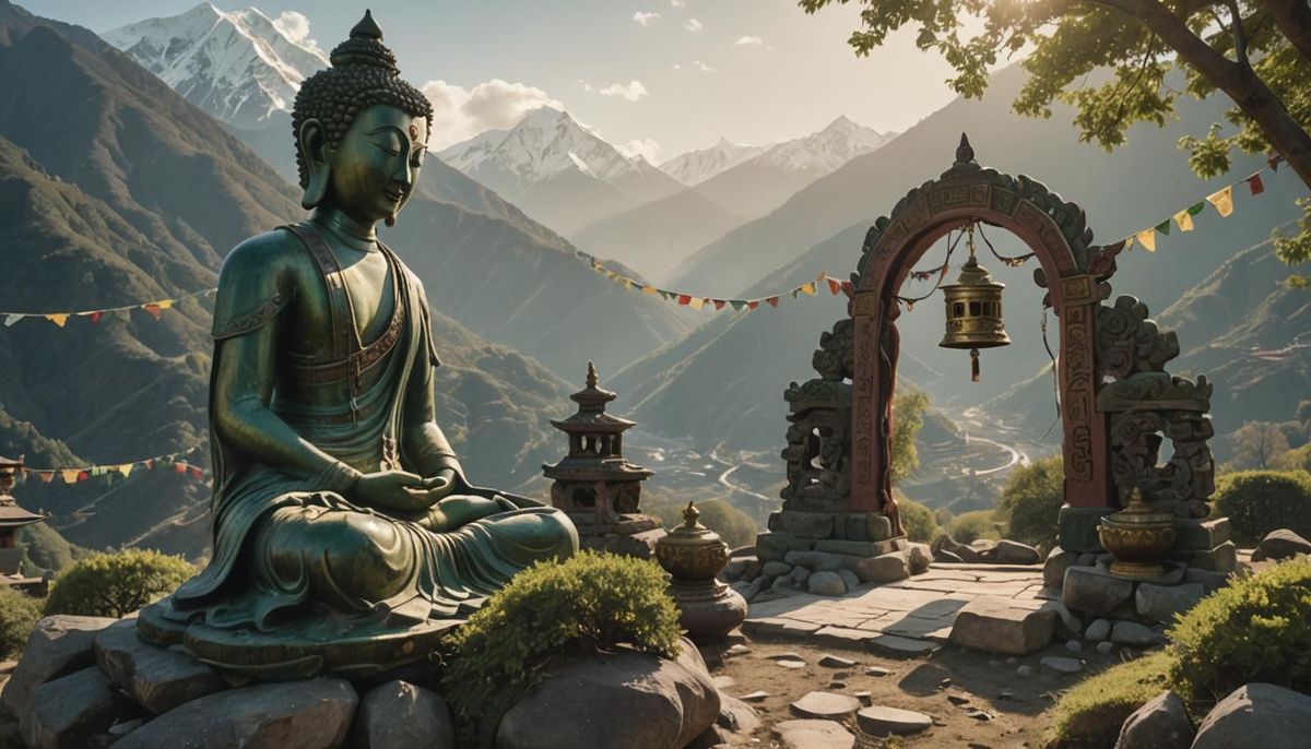 A serene image shows a Green Tara statue adorned with a third eye, encircled by a bronze prayer wheel and prayer flags, set against a backdrop of rugged mountains in warm, soft light.