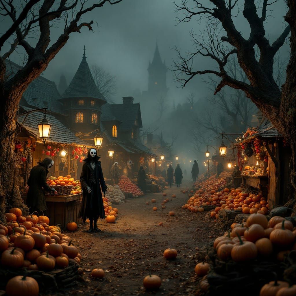 This image depicts a spooky harvest festival in a foggy village, featuring stalls laden with pumpkins and apples, adorned with eerie decorations.