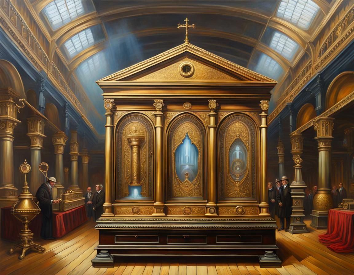 This image shows the Ark of the Covenant displayed in a grand hall. The artwork evokes a Victorian Steampunk aesthetic, rendered with the texture of an oil painting.
