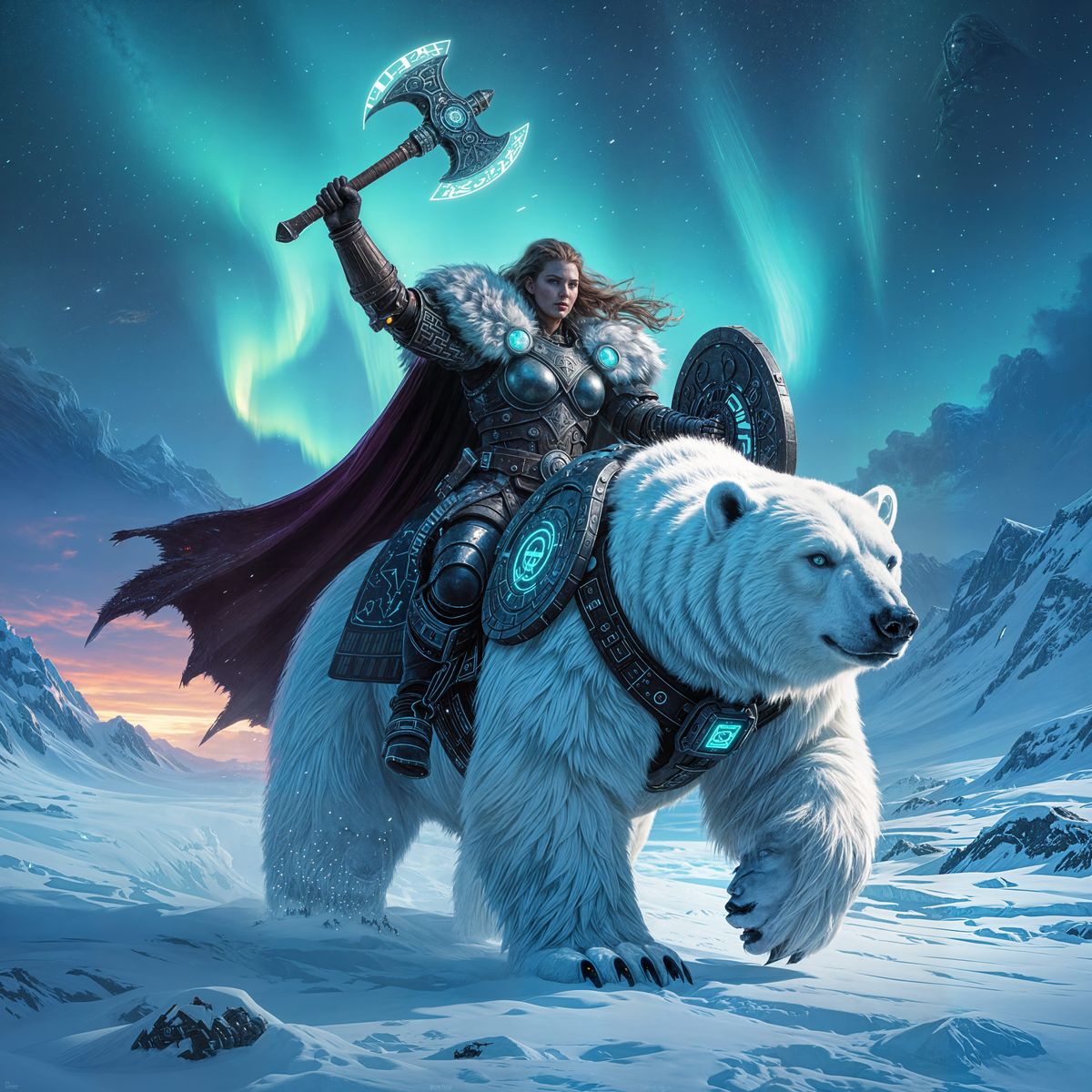 A striking picture of a plus-size Viking shieldmaiden riding a cybernetic polar bear across a glacial battlefield. The scene blends dark fantasy and cyberpunk aesthetics with dynamic lighting.