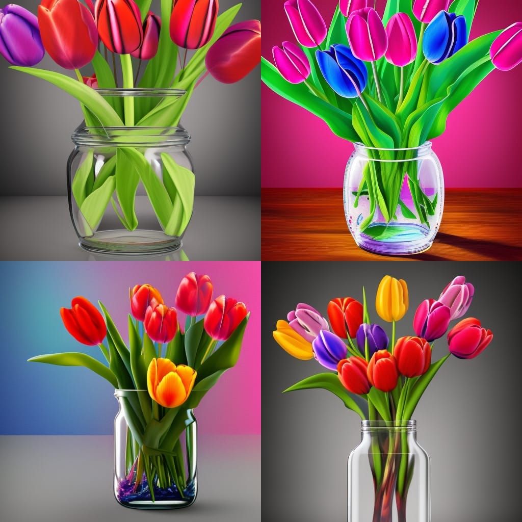 A vibrant image of colorful tulips arranged in a glass jar on a table. Rendered in a hyperrealistic splash art style with intricate details and dramatic side lighting.