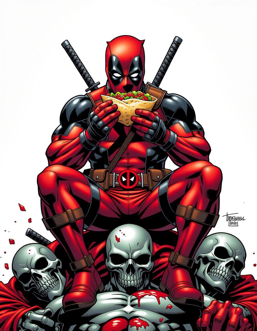 A comic book cover illustration of Deadpool enjoying a chimichanga while seated on defeated bandits. The artwork features high contrast and meticulous detail.