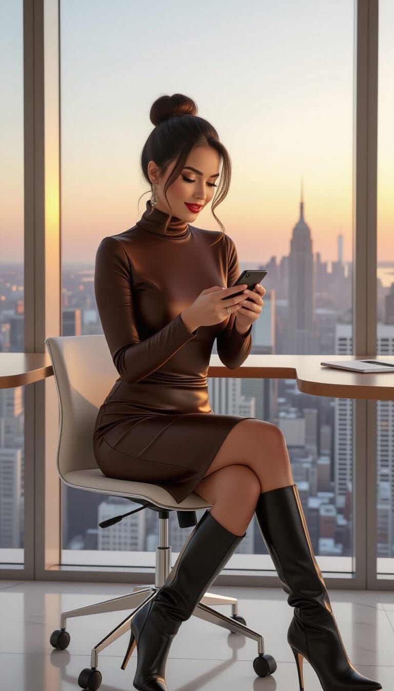 A photorealistic image of a mixed-race Latina woman working in a modern office. The sunset reflects off the city skyline viewed through floor-to-ceiling windows. The style is reminiscent of Art Nouveau.