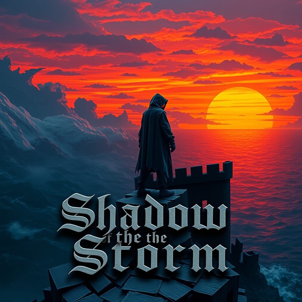 This image shows a solitary cloaked figure on a ruined castle, gazing at a stormy sea. A vibrant sunset silhouettes the character with glowing red eyes, in a gothic papercraft style.