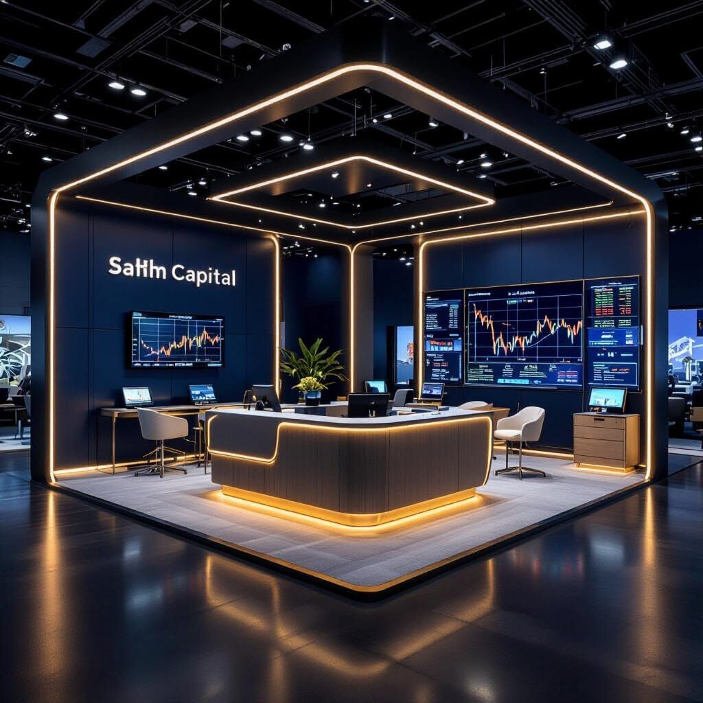 This image showcases a luxurious and tech-forward Sahm Capital booth design, featuring dark blue, gold, and white elements, a reception area, and interactive displays, presented in a cinematic film style.