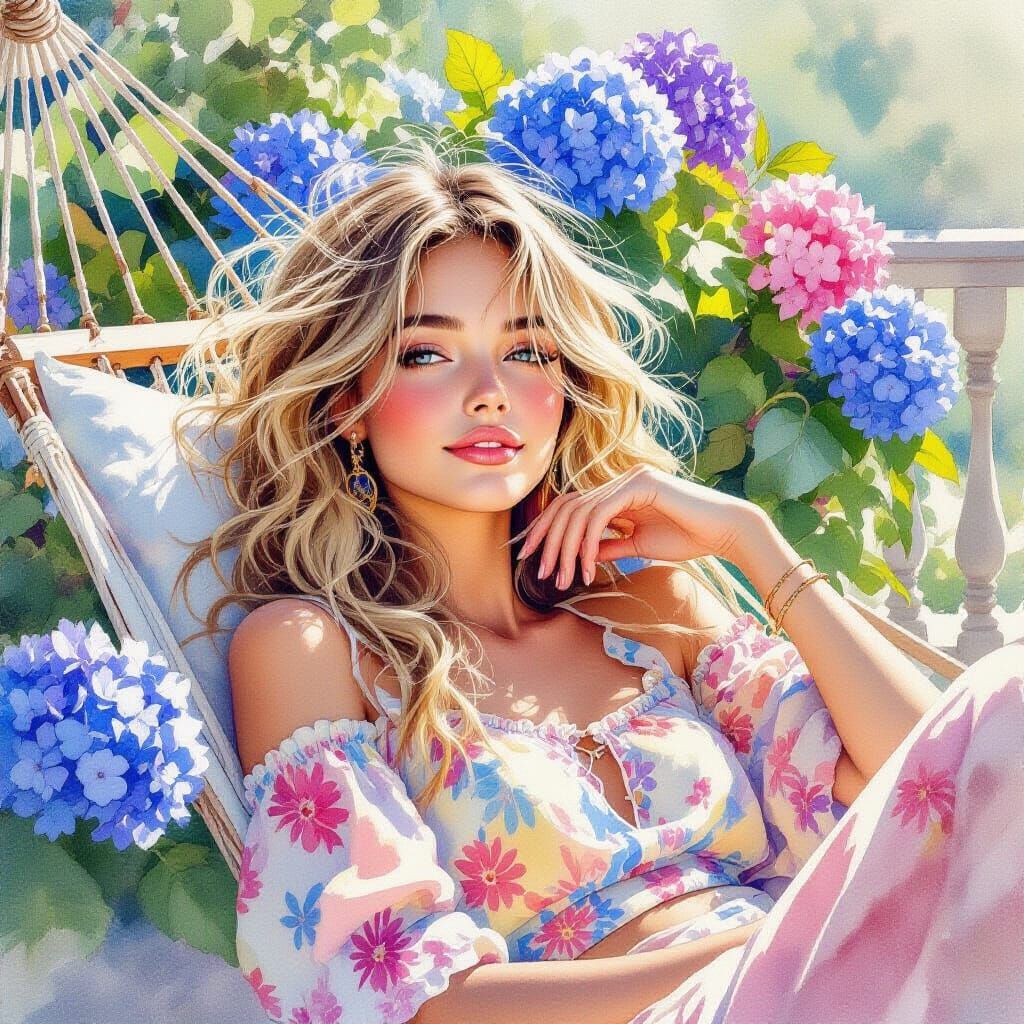 This image shows a close-up watercolor painting of a beautiful girl with blonde hair in 1960s hippie attire, relaxing in a hammock on a flower-filled terrace. The art style features loose brushstrokes and blended colors.