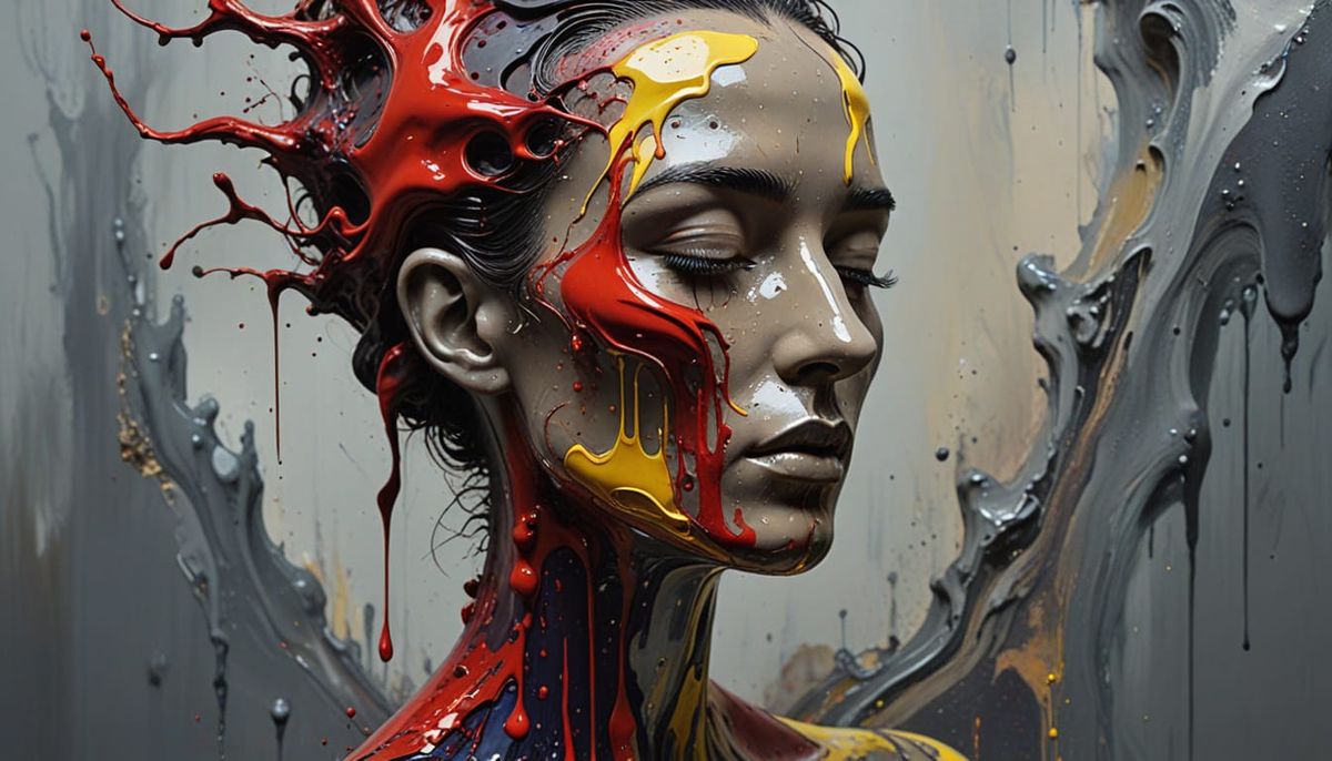 A surreal image shows a melting, faceless figure in a distorted dreamscape. The oil painting style features thick brushstrokes, dripping pigments, and cracked paint layers in muted grays and crimson.