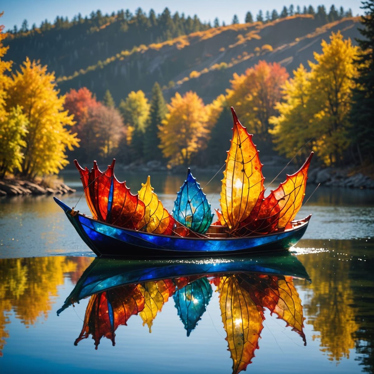 A vibrant glass sculpture of a ship glides on a shimmering lake under the sun. Captured with professional photography techniques, the image features a bokeh effect and sharp focus.