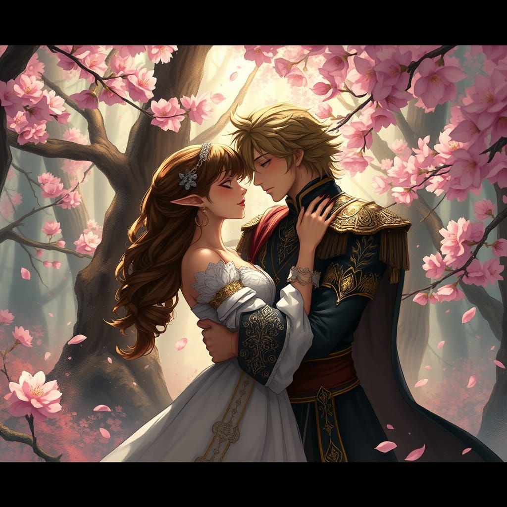 This image shows a tender moment between Astolfo and his beloved in a serene, anime-inspired forest setting, surrounded by cherry blossoms and soft light, evoking a sense of romance and wonder, with a dramatic, cinematic aesthetic
