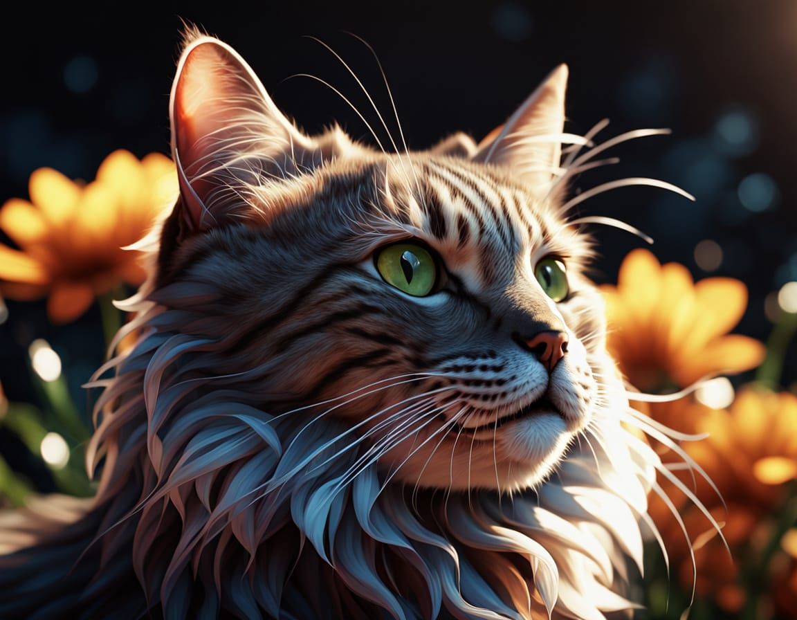 This image shows a cat portrait with long, flowing hair, surrounded by floral vectors. The digital art features soft textures, iridescent petals, and a blurred background, all rendered with cinematic lighting.