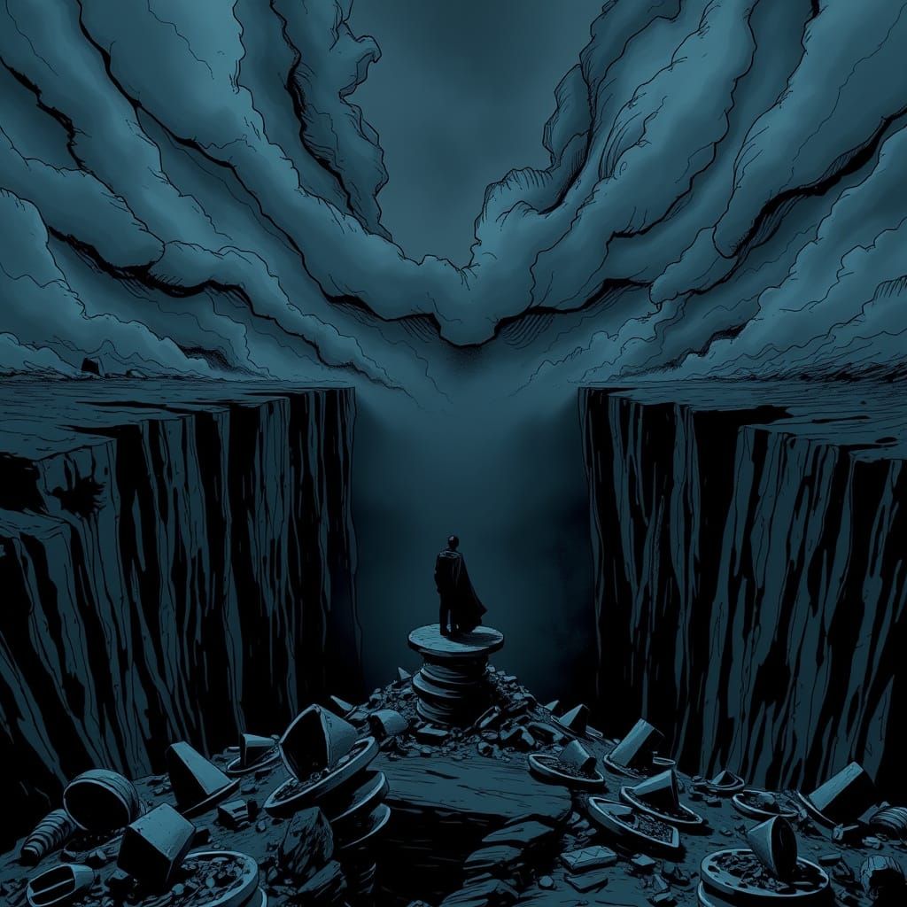 This image depicts fear of failure as a lone figure facing a dark chasm, with shattered pedestals symbolizing past struggles. Rendered in a dramatic graphic novel style with intense linework and stark lighting.