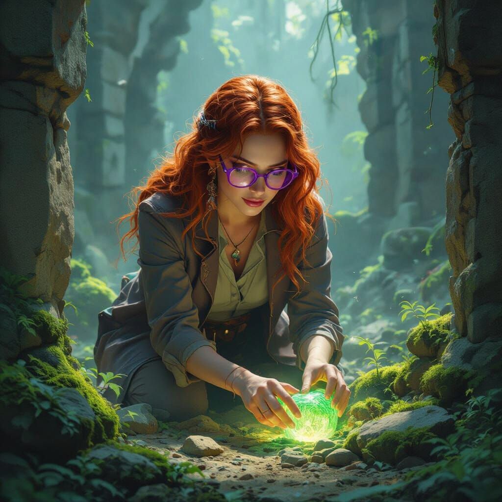 This image shows a red-haired archeologist discovering an artifact in a ruined temple. The scene is bathed in the soft glow of bioluminescent moss, rendered in an art nouveau style.