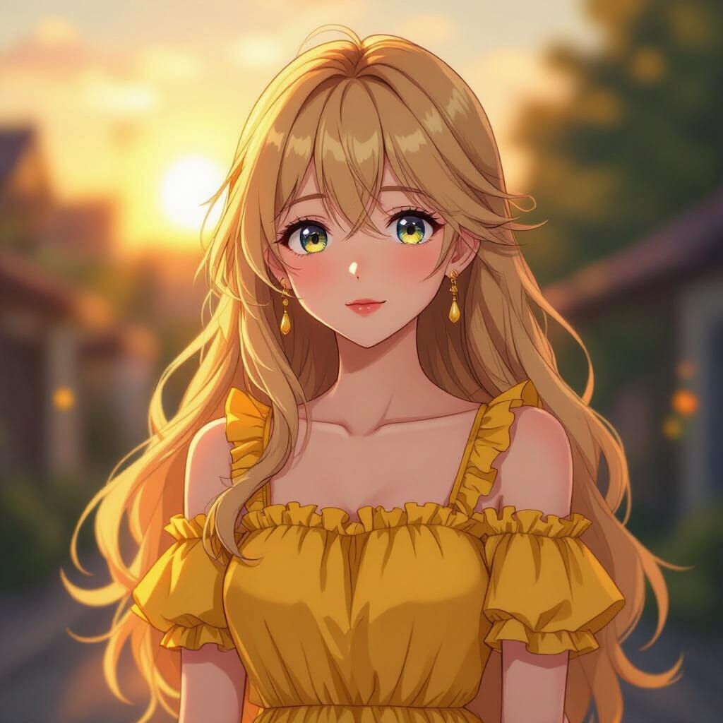 This image features a blonde anime character with expressive eyes, wearing a yellow ruffled dress. The scene captures a sense of motion with dynamic golden hour lighting, reminiscent of animated film styles.