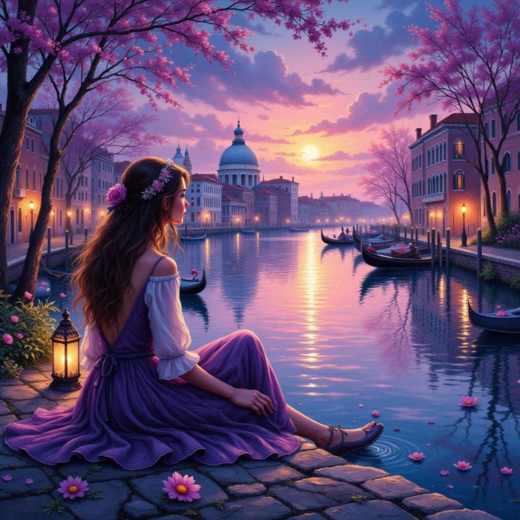 A captivating image shows a girl sitting by a calm river, looking towards a historical Venice. The city lights reflect in the water, enhanced with deep purples, blues, and golds in a fantasy style.