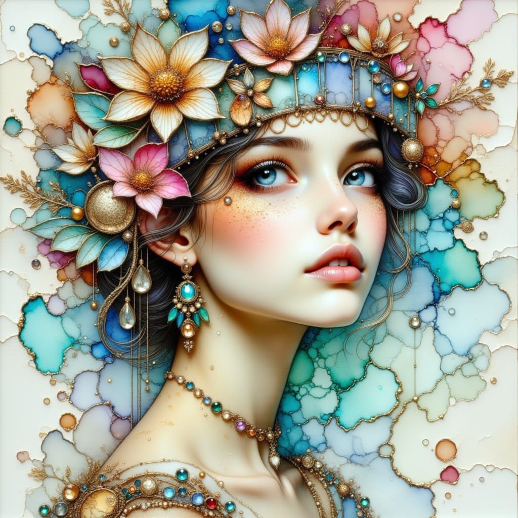 This charming watercolor portrait of a young woman in a 1920s style setting features a delicate floral headband and a soft, magical aura. The image showcases soft focus and watercolor textures, evoking a sense of wonder and ethereal beauty.
