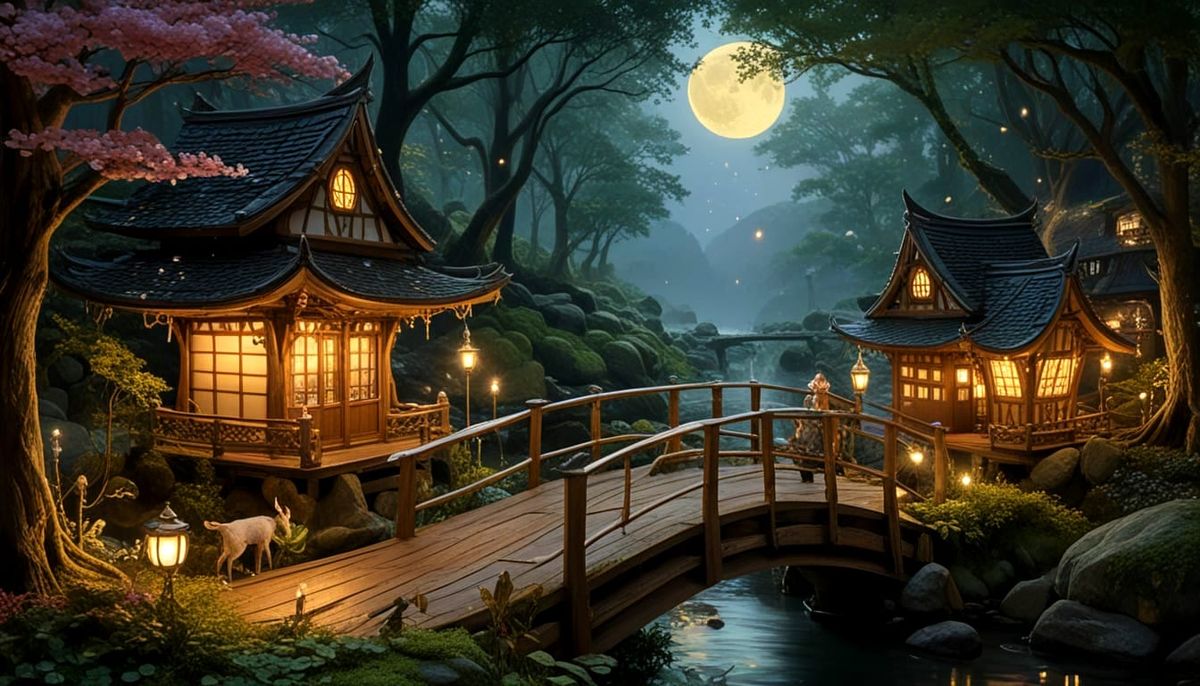 This serene image captures a mystical elf playing a glowing lute amidst a Japanese-inspired forest setting, surrounded by fireflies, lanterns, and swaying sakura blossoms, radiating a sense of harmony and peacefulness