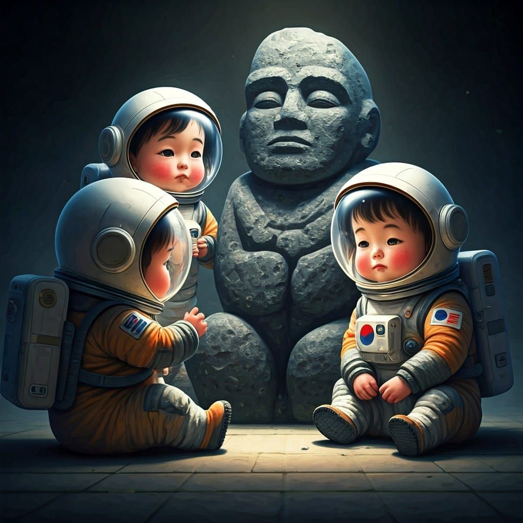 This enchanting watercolor illustration depicts adorable Korean astronaut babies gathered around an abstract sculpture, their large eyes fixed intently on the stone. Rendered in stunning 3D detail with Unreal Engine, the scene showcases intricate textures and subtle shading.