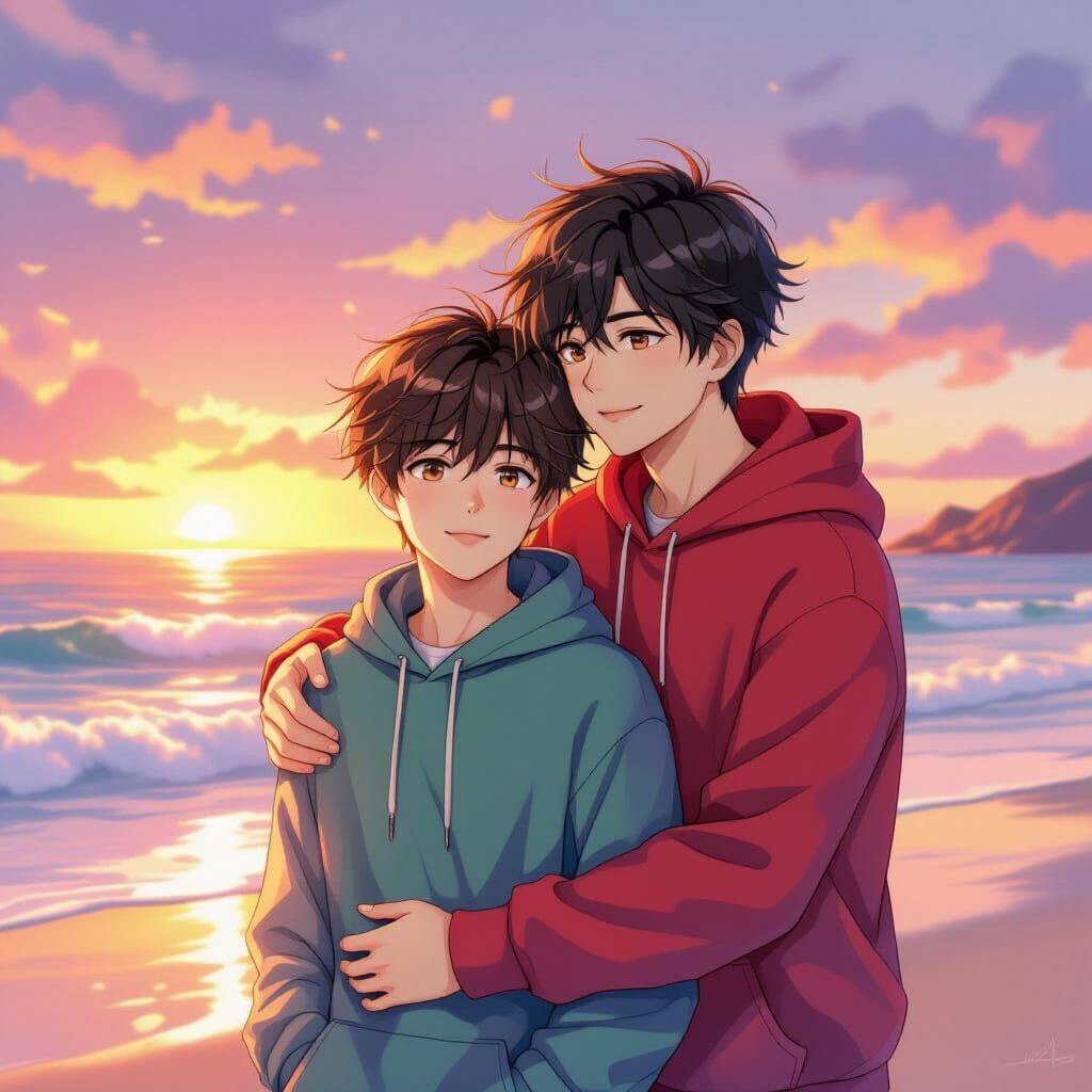 This image shows two young men embracing on a beach at sunset. They are wearing hoodies, with gentle waves in the background, created in a pastel-colored romantic anime style.