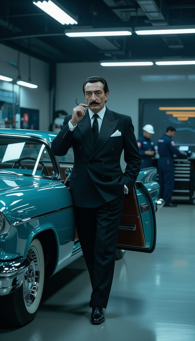This image shows Salvador Dali exiting a futuristic car in a luxurious garage. The scene is rendered in a cinematic style with bold lighting and deep shadows, reminiscent of retro-futuristic concept art.