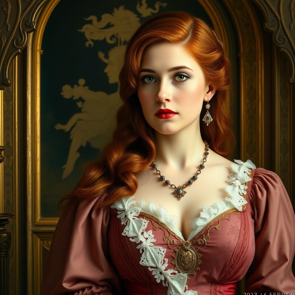 A stunning portrait of a Victorian-era woman, set against a lavish backdrop, showcasing her statuesque figure, elegant attire, and ethereal gaze. In the style of Pre-Raphaelite art, with intricate details and a blend of realism and romanticism.
