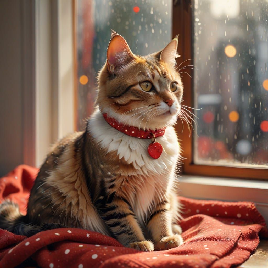 A cozy illustration of a cat with a polka dot collar on a blanket. Soft, warm lighting illuminates the scene, with a rainy window adding to the comfortable atmosphere in watercolor style.