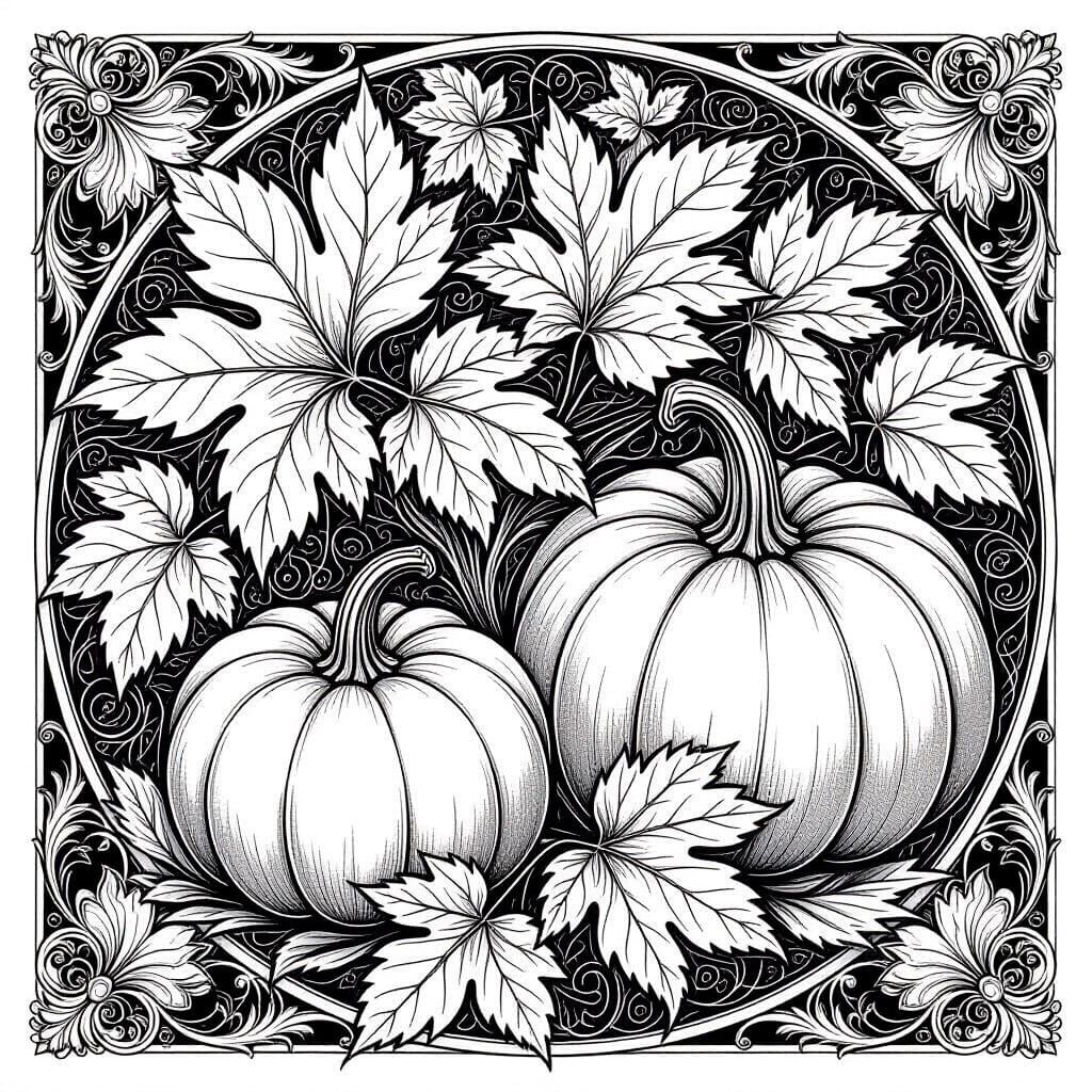 This detailed high-definition black and white coloring page features autumn leaves and pumpkins with intricate line art. Inspired by Art Nouveau, it offers flowing organic lines and decorative patterns for adult coloring enthusiasts.