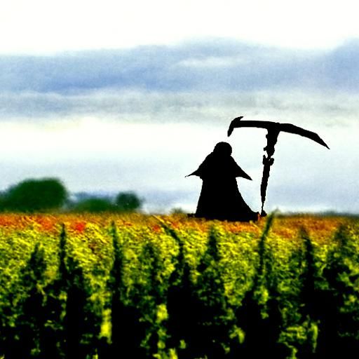 This image shows a surreal rendition of the Reaper Man tending to a harvest. It evokes themes of care and hope within a fantastical, possibly slightly dark, context.