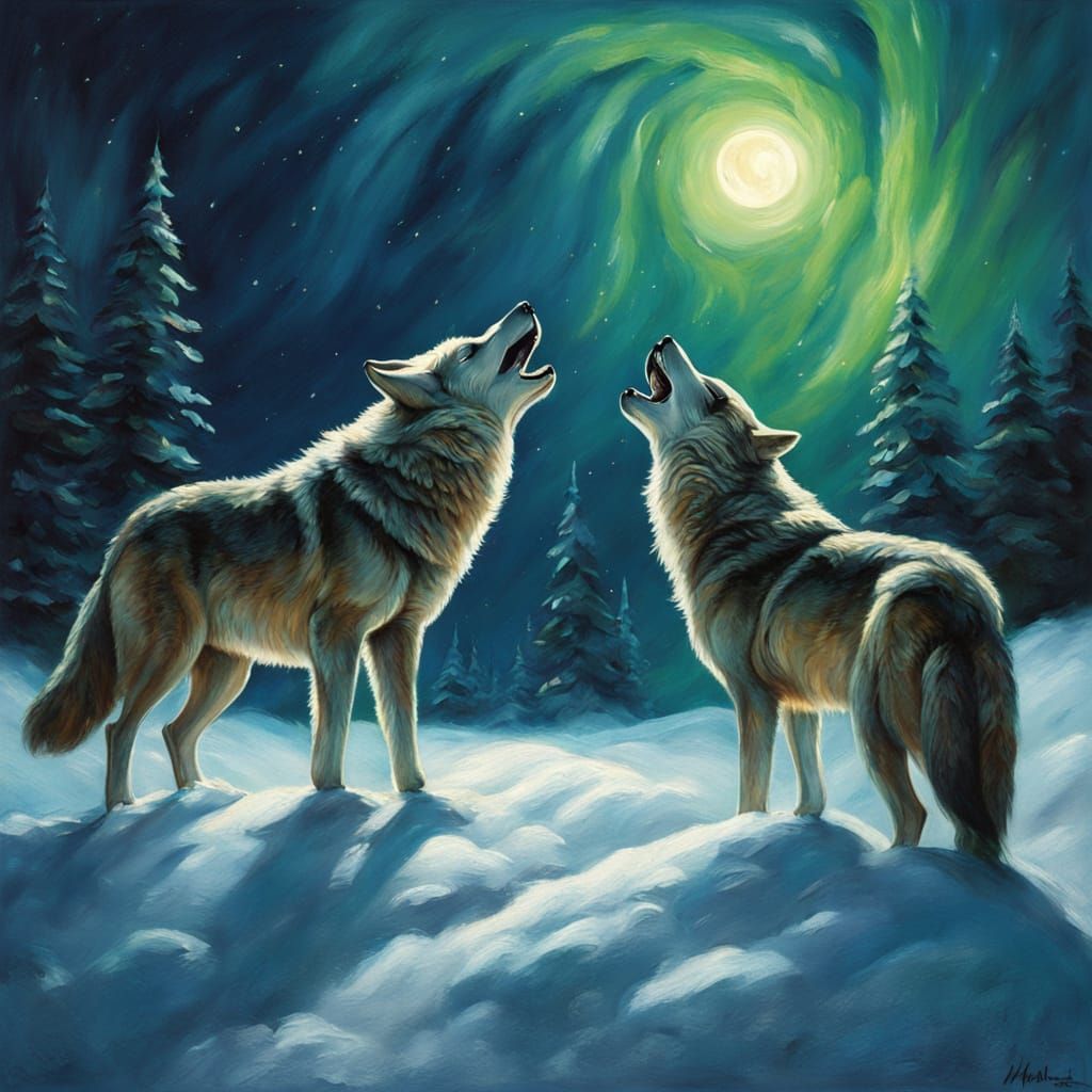 This image shows a pack of wolves howling at a full moon under a starry sky illuminated by the aurora borealis. Created in an impressionistic oil painting style with vibrant blues and greens.