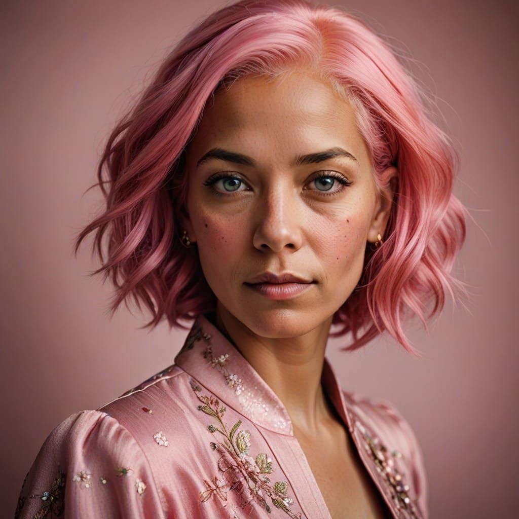 A vibrant close-up portrait of a woman with pink hair, reminiscent of professional headshots. The image features a soft bokeh, warm studio lighting, and high contrast, capturing a masterful composition.