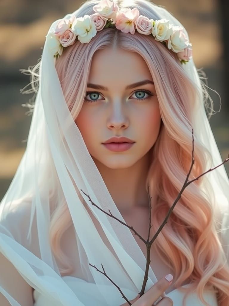 A captivating image of a woman with pastel pink hair and a floral crown. The soft lighting and sheer fabric create an ethereal, romantic atmosphere in this photograph.