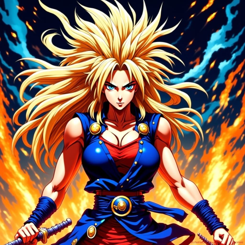 This image portrays a female character reminiscent of Dragon Ball Z, wielding a sword amidst fiery surroundings. The vibrant illustration showcases a dynamic anime aesthetic with bold colors.