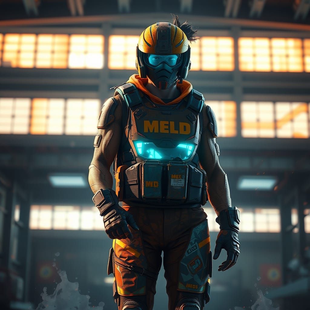 A hyperdetailed concept art image of an industrial athlete. The artwork features dynamic lighting, intricate details, and triadic colors in an orange and teal color scheme.
