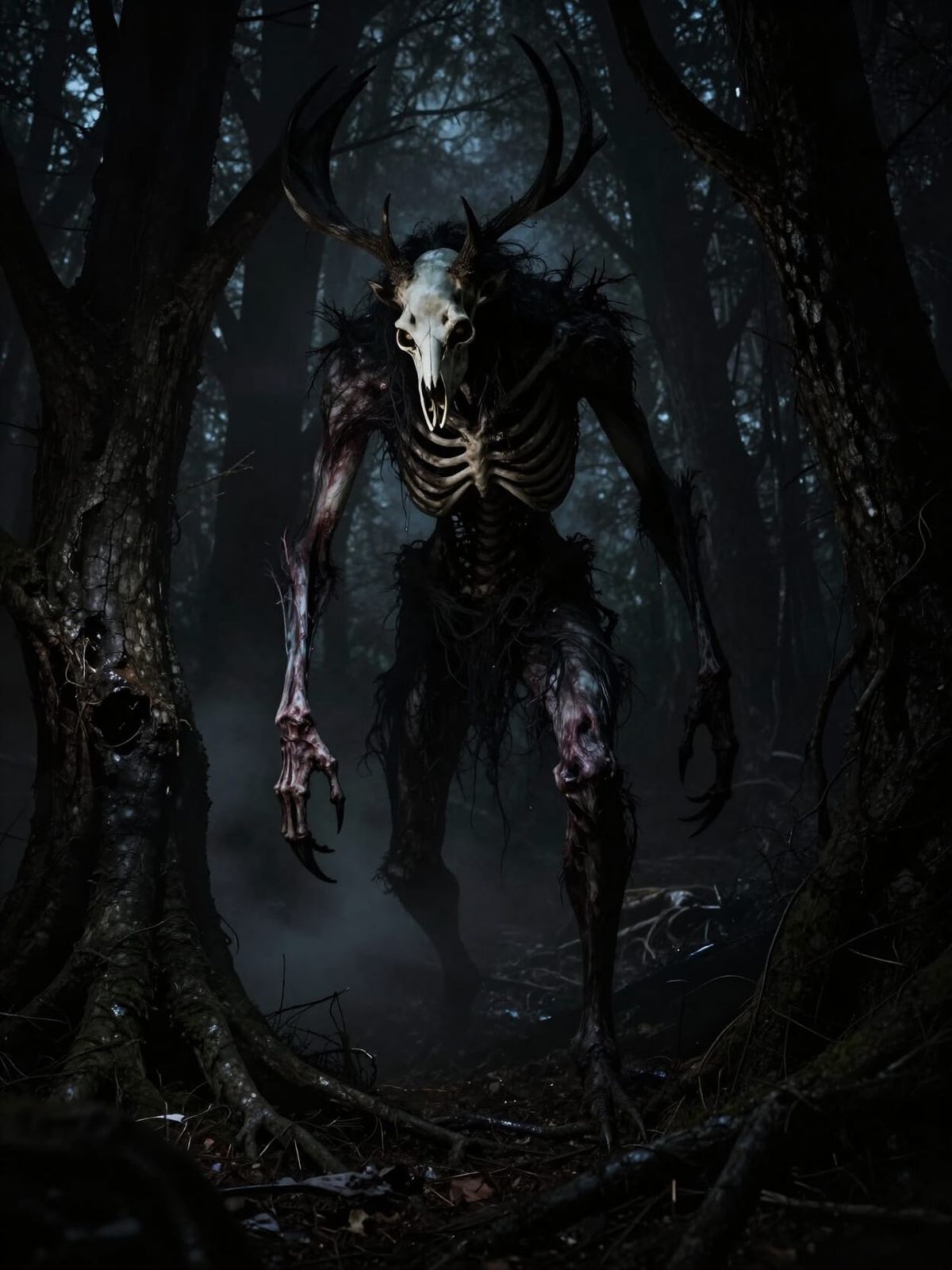 This image shows a gaunt wendigo with deer-like features in a dark fantasy forest. Extreme light and shadow create an eerie, oppressive atmosphere with cinematic realism.