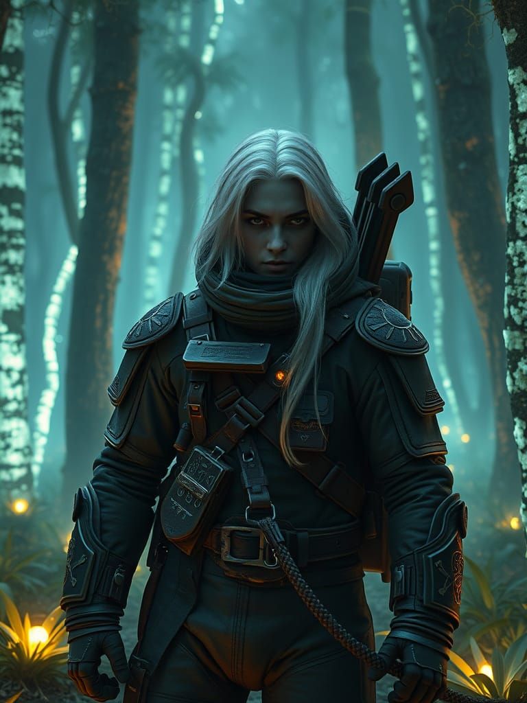 This image shows a young astronaut in a high-tech space suit, surrounded by a mystical forest pulsing with energy. A female drow ranger emerges, with glowing eyes and ancient magic, in a cinematic scene blending sci-fi and fantasy elements.