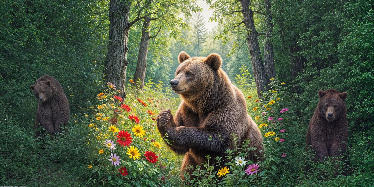 This image depicts a large brown bear in a forest, smelling flowers and appearing happy. The scene captures a serene moment in nature with a focus on the bear's joyful interaction with its environment.