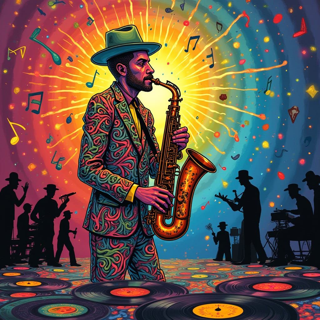 A vibrant musician composed of colors and notes plays a radiant saxophone. Dancing silhouettes surround the musician on a vinyl record stage in this psychedelic pop art image.